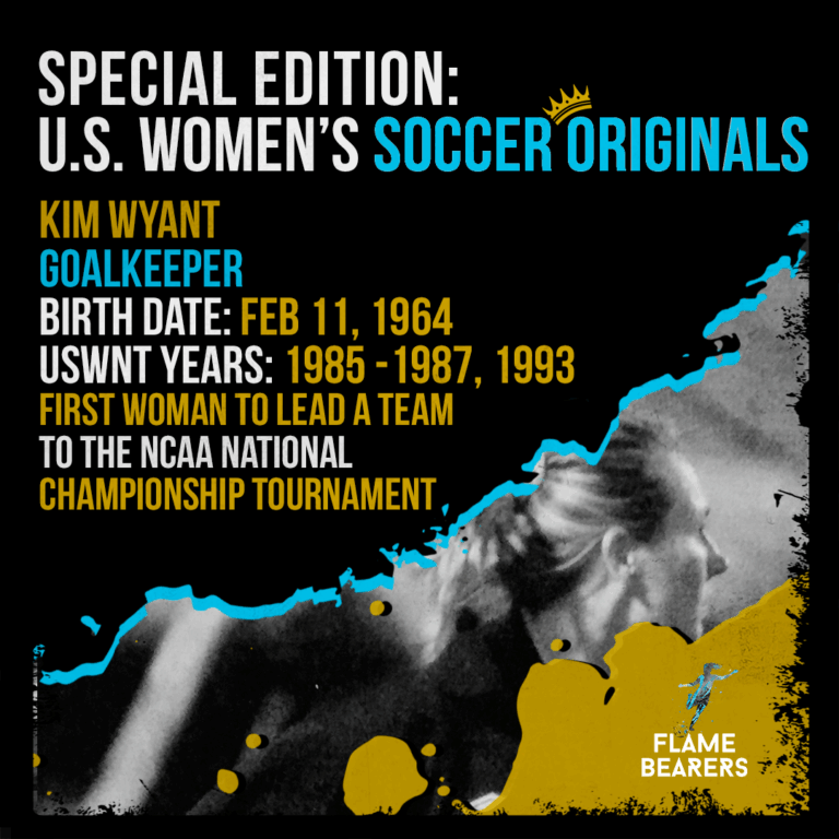 Kim Wyant is used to being the first. She recorded the first USWNT goalkeeper win, the first shutout, the first anterior ACL injury (was the first goalie to be replaced by a field player, shoutout Lori Henry), was one of the first female BMX riders, and as of eight years ago (in 2015) became the only female head coach of an NCAA men’s soccer team (things have changed as we’ll hear…) Needless to say, Kim is a Flame Bearer in so many ways.