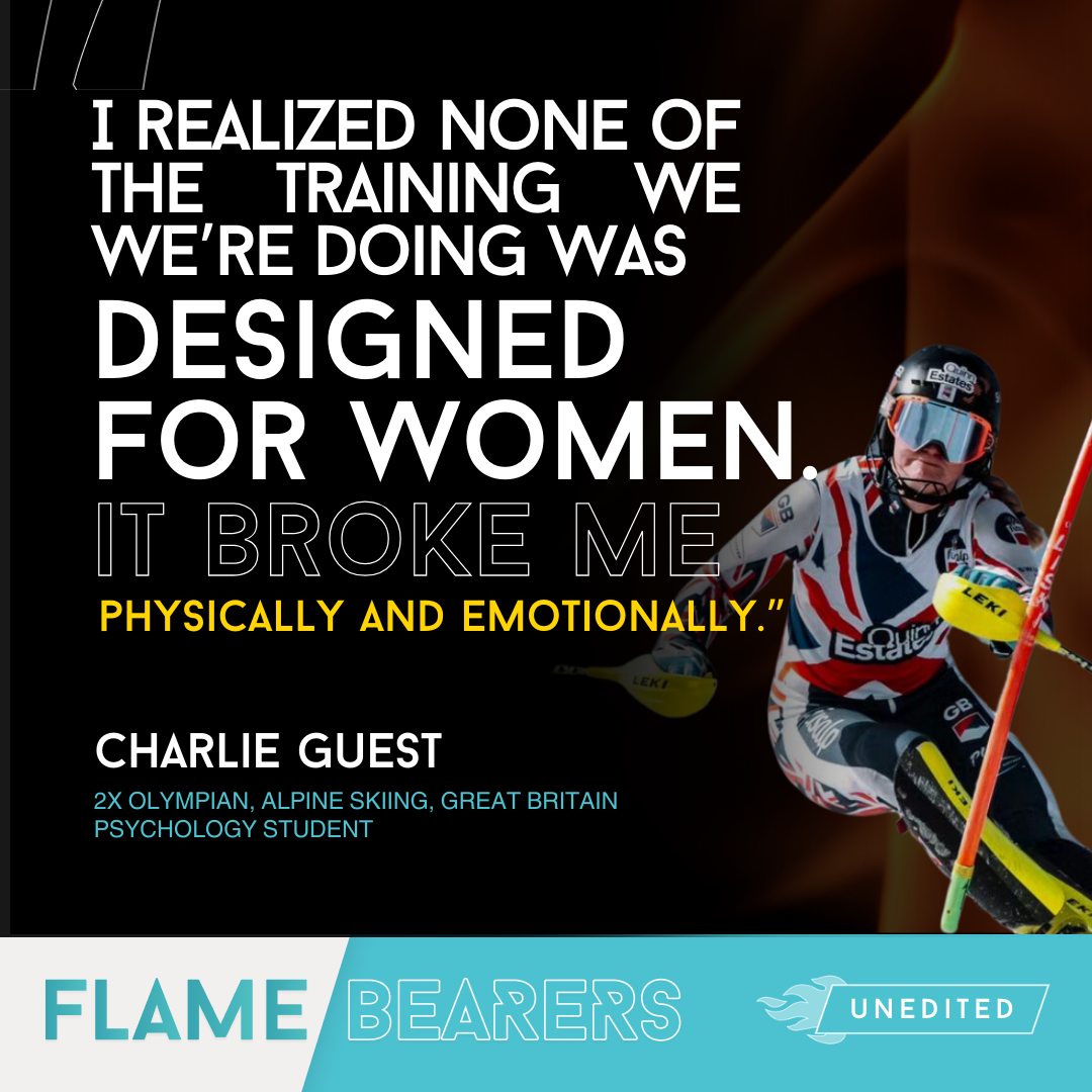 Charlie Guest, is a 2x Olympic skier, psych student, and an advocate for gender equity in sports. After breaking her back in 2014, Charlie went on to become the first British woman to ever win an Alpine European Cup (2019) and later went on to rack up 3 titles. Charlie opens up about her passion for skiing and the systemic inequalities she’s encountered. Specifically, Charlie recounts the infuriating disparities in media coverage during last year’s Junior Alpine World Championships championship, where men’s races were given priority while women’s events were ignored. “It wasn’t an accident. It was a choice,” she shares. She highlights how these decisions have ripple effects, impacting sponsorships, visibility, and future opportunities for women athletes.